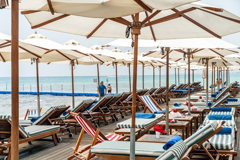 L’hôtel compte un total de 361 chambres (288 chambres doubles, 6 chambres doubles spacieuses, 51 chambres familiales dont 15 communicantes, 11 chambre singles et 5 suites). 60% d’entre elles donnent directement sur la mer, les autres ouvrant sur la piscine ou sur les jardins, et toutes disposent d’un balcon. Réparties en trois blocs de trois étages, elles sont dotées des commodités d’usage : télévision satellite, coffre-fort, téléphone, mini-frigo, air conditionné et chauffage, salle de bains équipée (baignoire ou douche, sèche-cheveux).